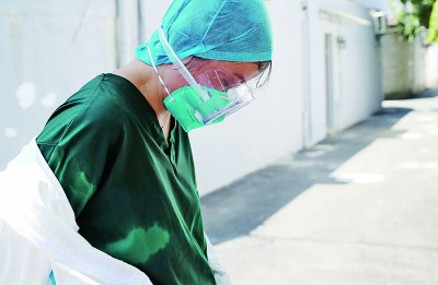 在上海市一个居民小区内,来自田林街道社区卫生服务中心的乔静完成样本采集后脱下防护服。新华社发