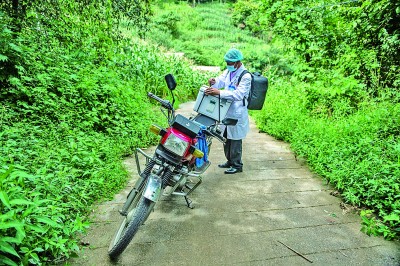 在贵州省六盘水市,“摩托”村医章忠武将药箱固定在摩托车上。新华社发