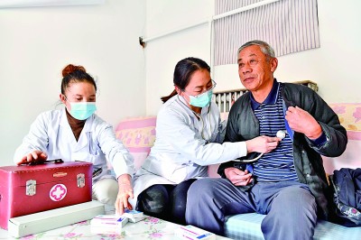 在山东省潍坊市寒亭区寒亭街道东院社区,卫生室医生王红霞在为村民看病。新华社发