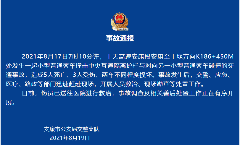 据陕西省安康市公安局交警支队8月19日通报,2021年8月17日7时10分许,十天高速安康段安康至十堰方向K186+450M处发生一起小型普通客车撞击中央互通隔离护栏与对向另一小型普通客车碰撞的交通事故,造成5人死亡、3人受伤、两车不同程度损坏。事故发生后,交警、应急、医疗、路政等部门迅速赶赴现场,开展人员救治、现场勘查等处置工作。