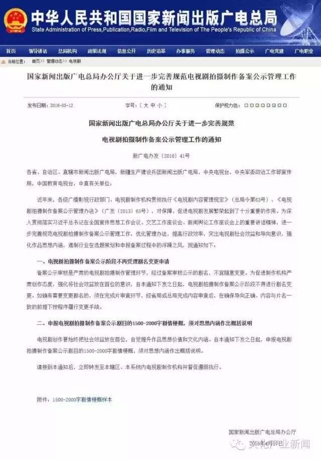 5月12日,国家新闻出版广电总局发布的《关于进一步完善规范电视剧拍摄制作备案公示管理工作的通知》显示:电视剧拍摄制作备案公示阶段不再受理剧名变更申请;同时,申报电视剧拍摄制作备案公示剧目的1500-2000字剧情梗概,须对思想内涵作出概括说明。以下为“通知”全文。