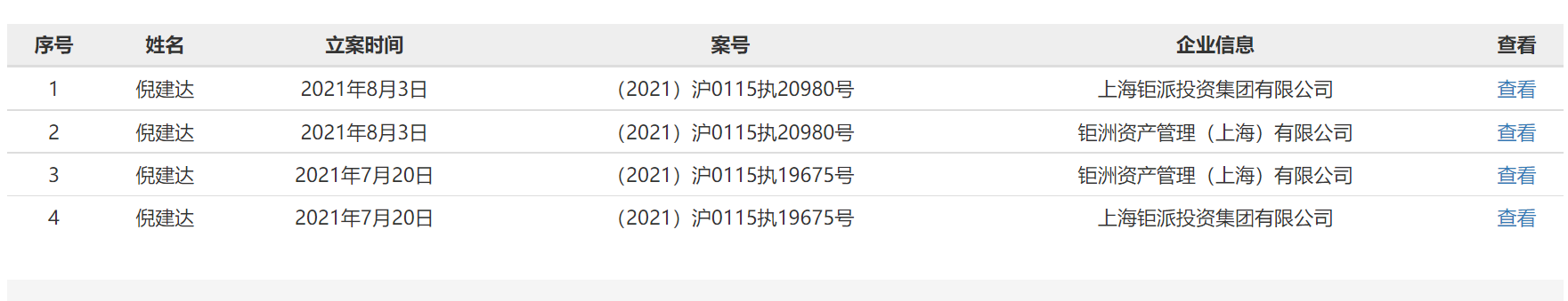 8月19日,界面新闻从执行信息公开网获悉,上海钜派投资集团有限公司(下称钜派投资)、钜洲资产管理(上海)有限公司(下称钜洲资产)已成为失信被执行人,两家公司的同一法人代表倪建达目前已被“限高”,他同时还是钜派集团的董事长兼CEO。