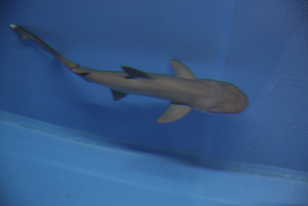 鲨鱼保育员吴镑说,这只新生的小家伙体长40公分,身体呈浅灰色,第一个背鳍和尾鳍顶端为白色,这也是区别它们与其他品类鲨鱼的方式之一。
