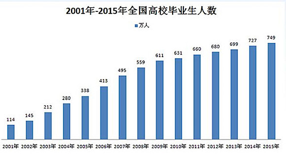 单纯从数据来看,确实如此。高校扩招16年来,全国高校毕业生总数已从1999年时的85万人,飙升至今年的765万人。