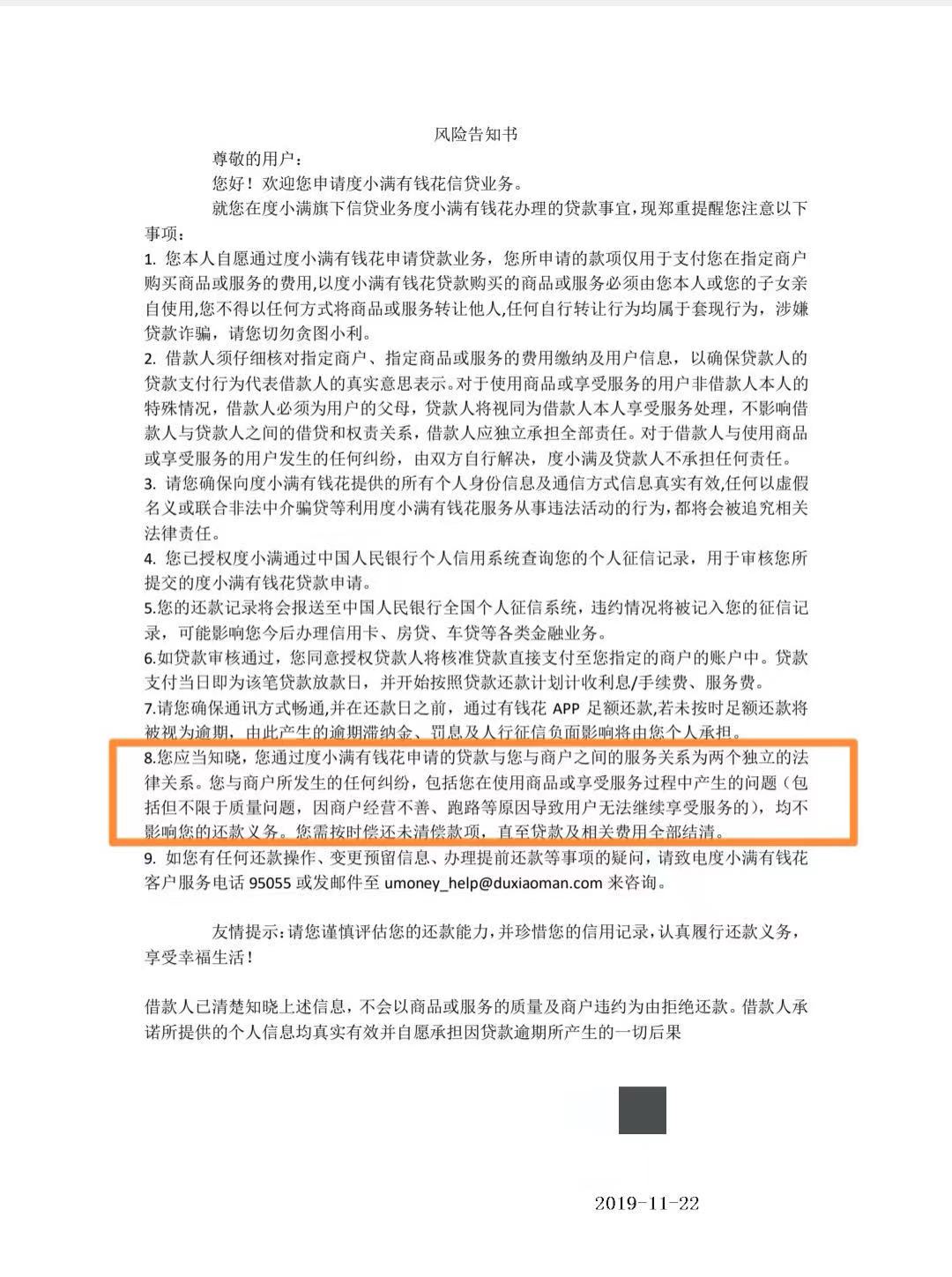 多位学员向界面新闻展示了来自度小满的风险告知书,其中均有条款提出,“借款人与贷款人之间的借贷和权责关系,借款人应独立承担全部责任,贷款生效后,对于借款人与使用商品或享受服务的用户之间发生的任何纠纷,由双方自行解决,度小满及贷款人不承担任何责任”。但学员也指出,在签署这份风险告知书之际,销售人员并未向其进行过详细介绍与警示。