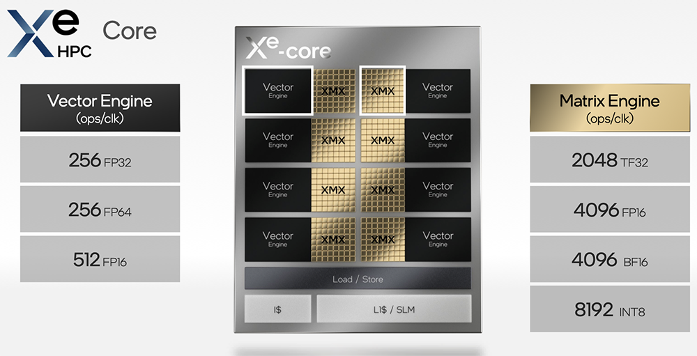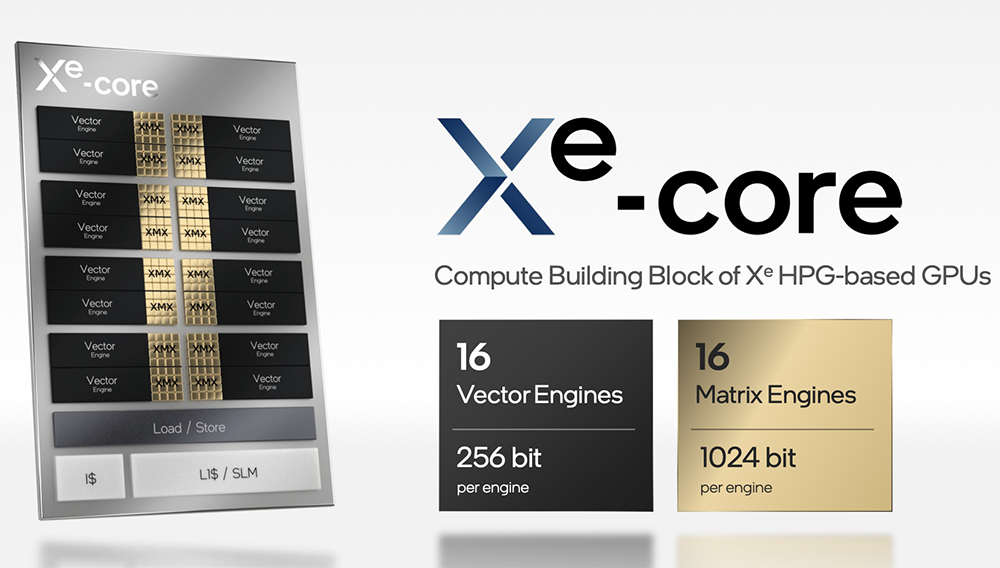Xe HPC微架构的IP模块信息被公布,包括每个Xe核的8个矢量和矩阵引擎(XMX)、切片和堆栈信息,以及包括计算、基础和Xe Link单元的处理节点的单元信息。