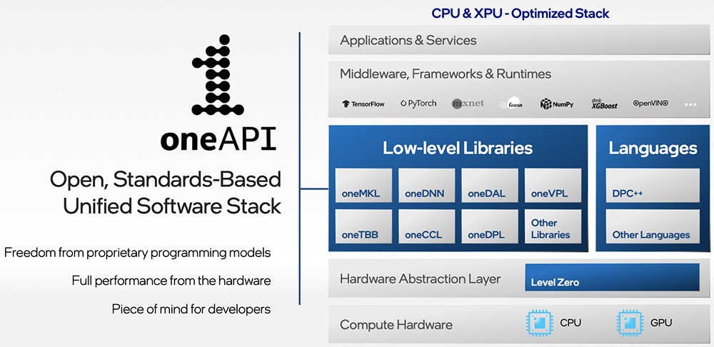 英特尔oneAPI是一个开放、规范、跨架构和跨厂商的统一软件栈,提供了跨架构的兼容性,让开发者能够摆脱专有语言和编程模型的束缚。