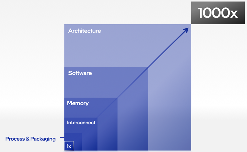 这些创新的架构与平台,均是为了更好地迎接越来越庞大的计算需求所带来的挑战。英特尔预计,到2025年算力需求将是1000倍级的提升,而四年内增加1000倍相当于摩尔定律的5次方。