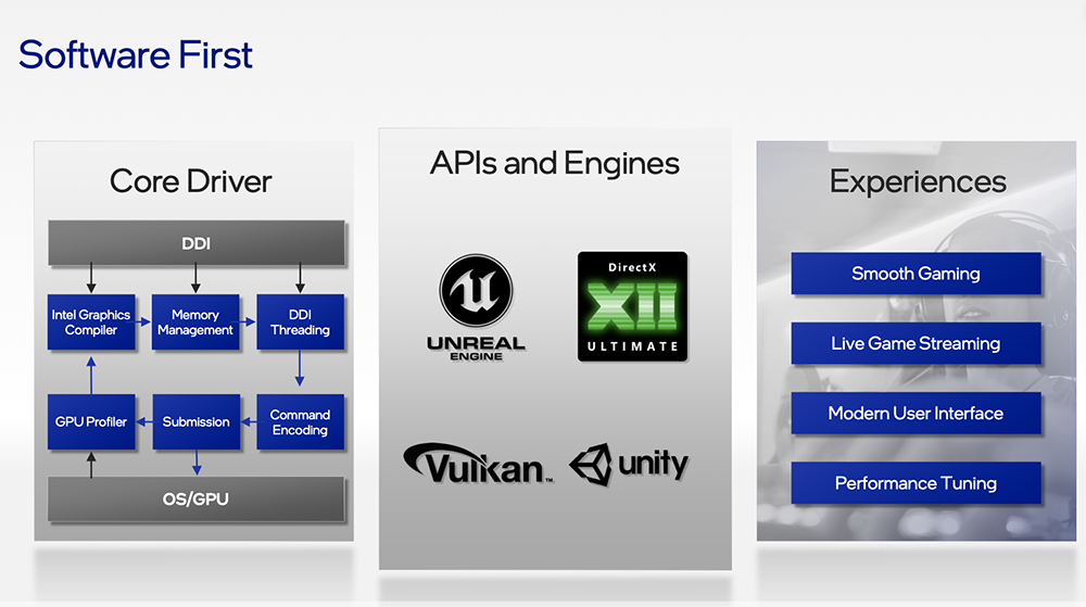英特尔显卡设计的核心是软件优先。英特尔正与开发人员密切合作进行Xe微架构的设计,力求与行业标准保持一致;通过在一个统一的代码库中涵盖集成和独立显卡产品的驱动设计,英特尔的第一款高性能游戏显卡将性能和质量放在首位。
