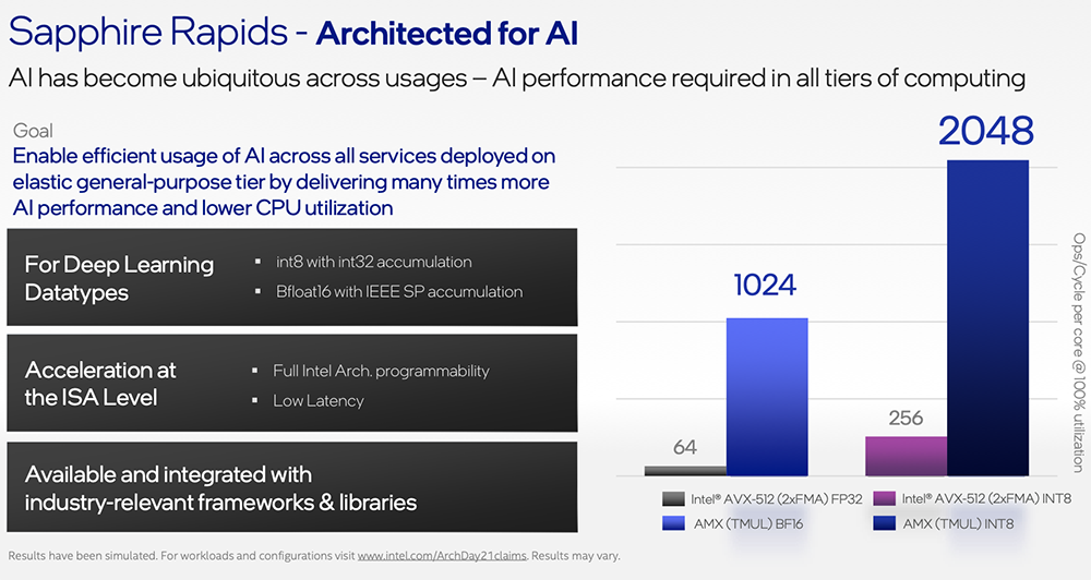 使用早期的Sapphire Rapids芯片,与使用英特尔AVX-512 VNNI指令的相同微基准测试版本相比,使用新的英特尔AMX指令集扩展优化的内部矩阵乘法微基准测试的运行速度提高了7倍以上,显著提升AI工作负载中的训练和推理性能。