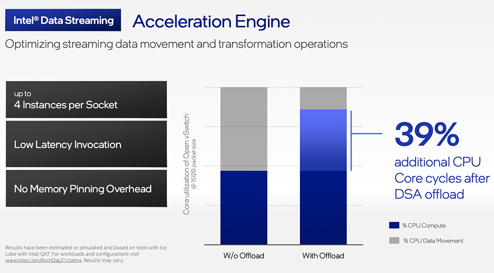 (3)英特尔数据流加速器(DSA):旨在卸载最常见的数据移动任务,改进了对这些开销任务的处理,以提供更高的整体工作负载性能,并可以在CPU、内存和缓存以及所有附加的内存、存储和网络设备之间移动数据。