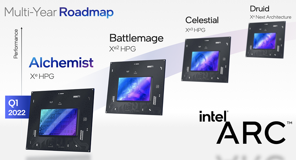 基于Xe HPG架构的英特尔客户端显卡路线图包括Alchemist(此前称之为DG2)、Battlemage、Celestial和Druid系列SoC。
