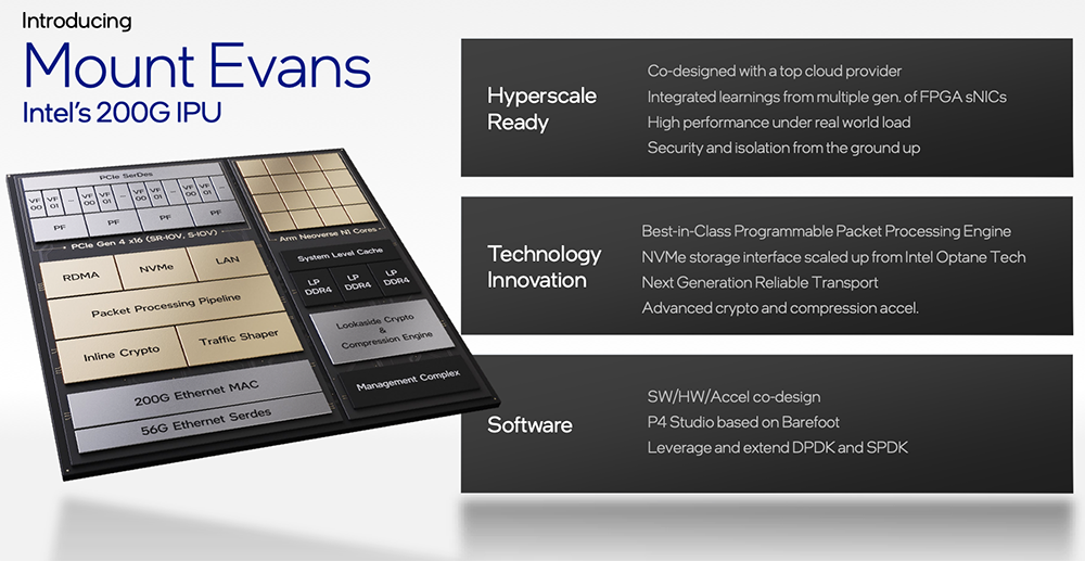 Mount Evans是英特尔与一家一流云服务提供商共同设计和开发的,它融合了英特尔多代FPGA SmartNIC的经验,超大规模就绪,提供高性能网络和存储虚拟化卸载,同时保持高度控制。