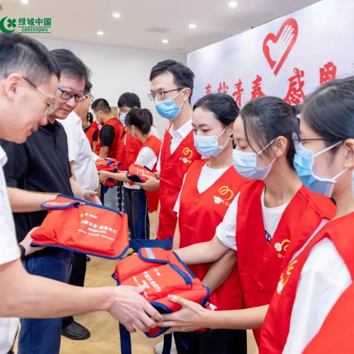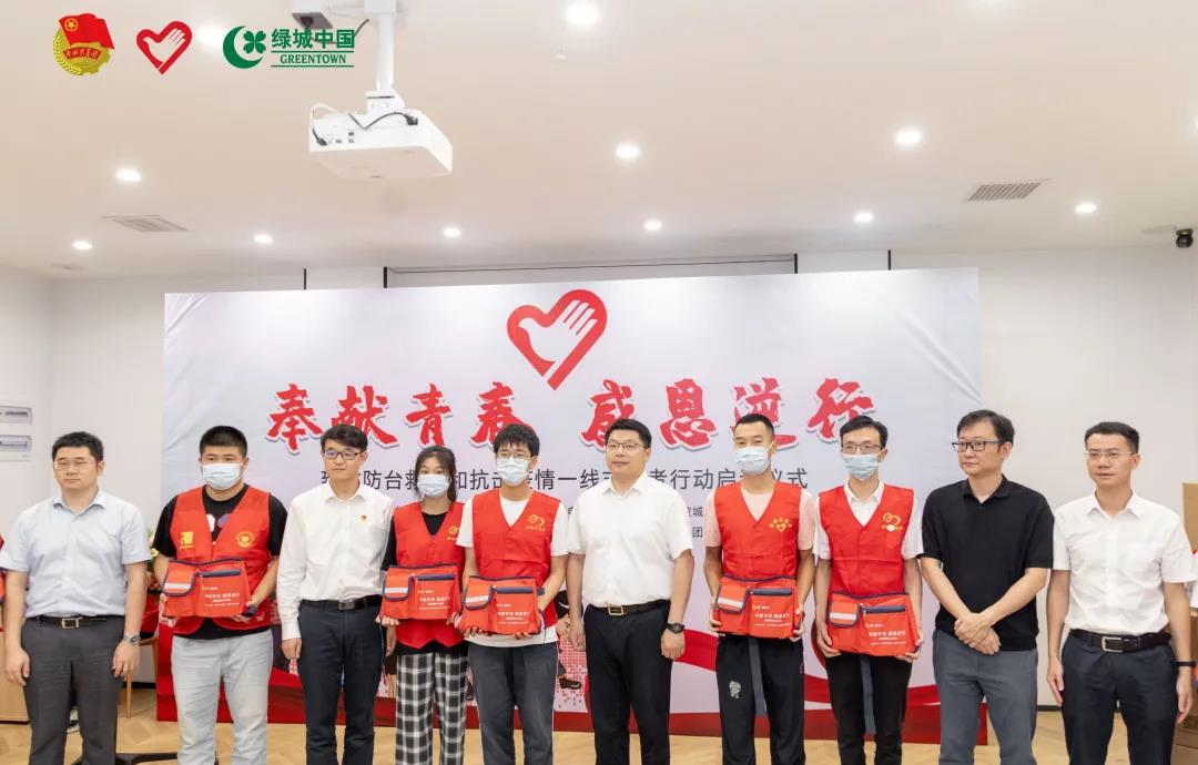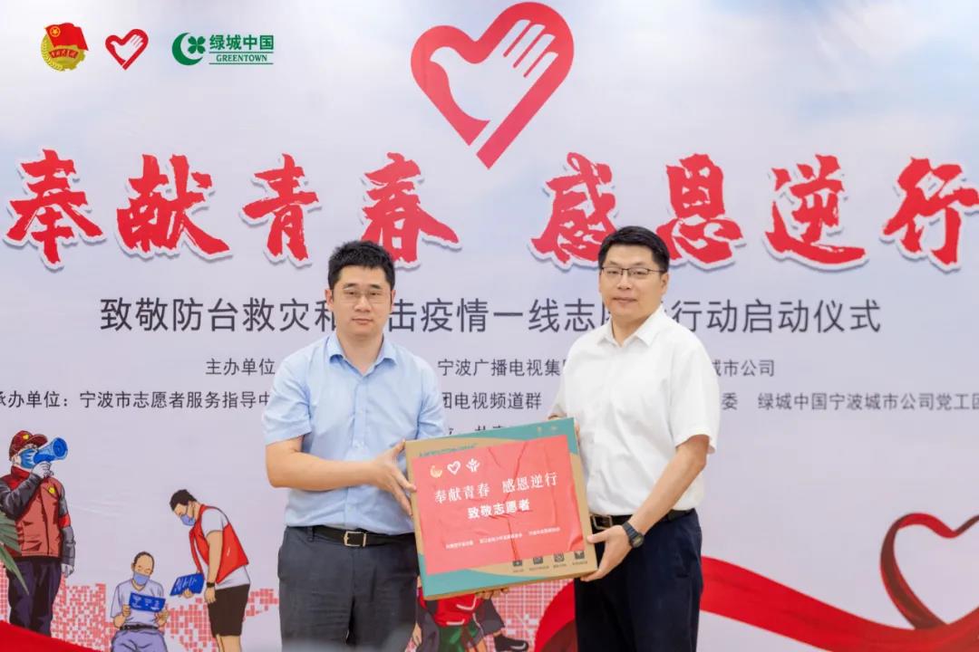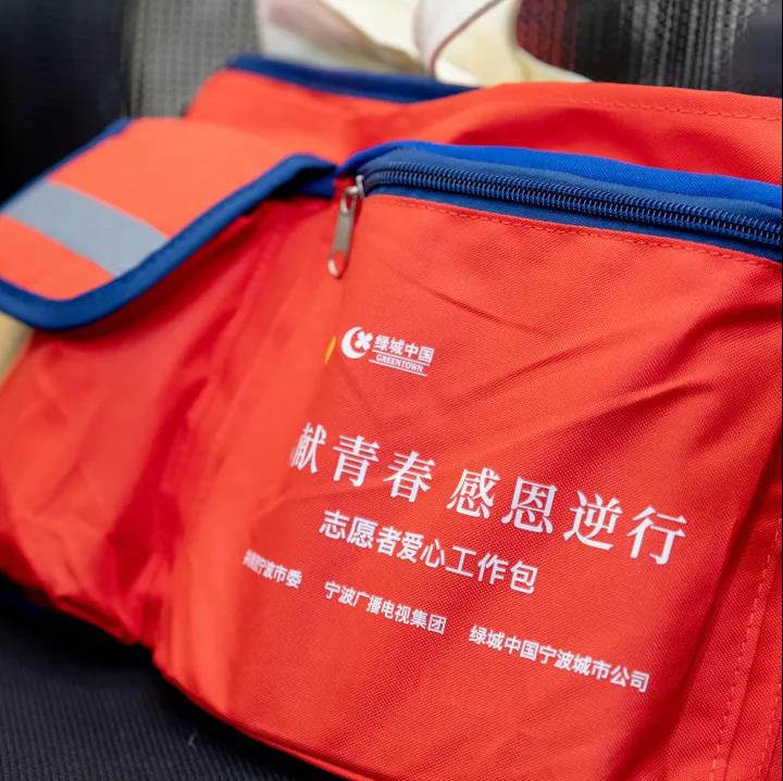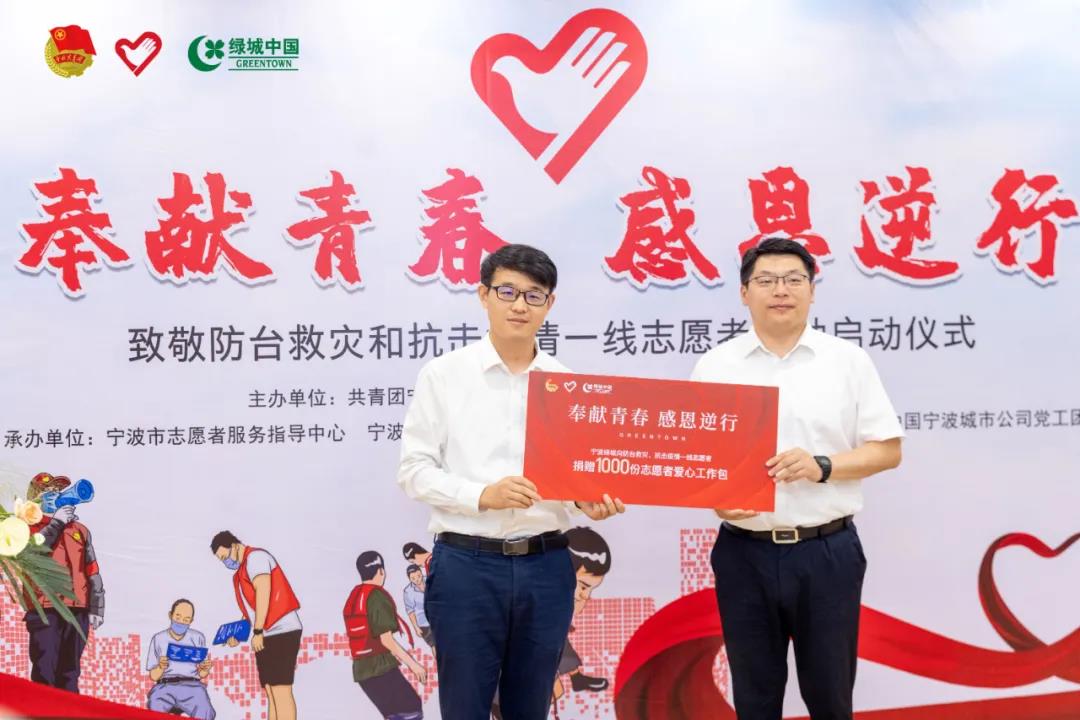 在仪式上,宁波绿城正式向防台救灾、抗击疫情一线的志愿者们捐赠了1000份志愿者爱心工作包。