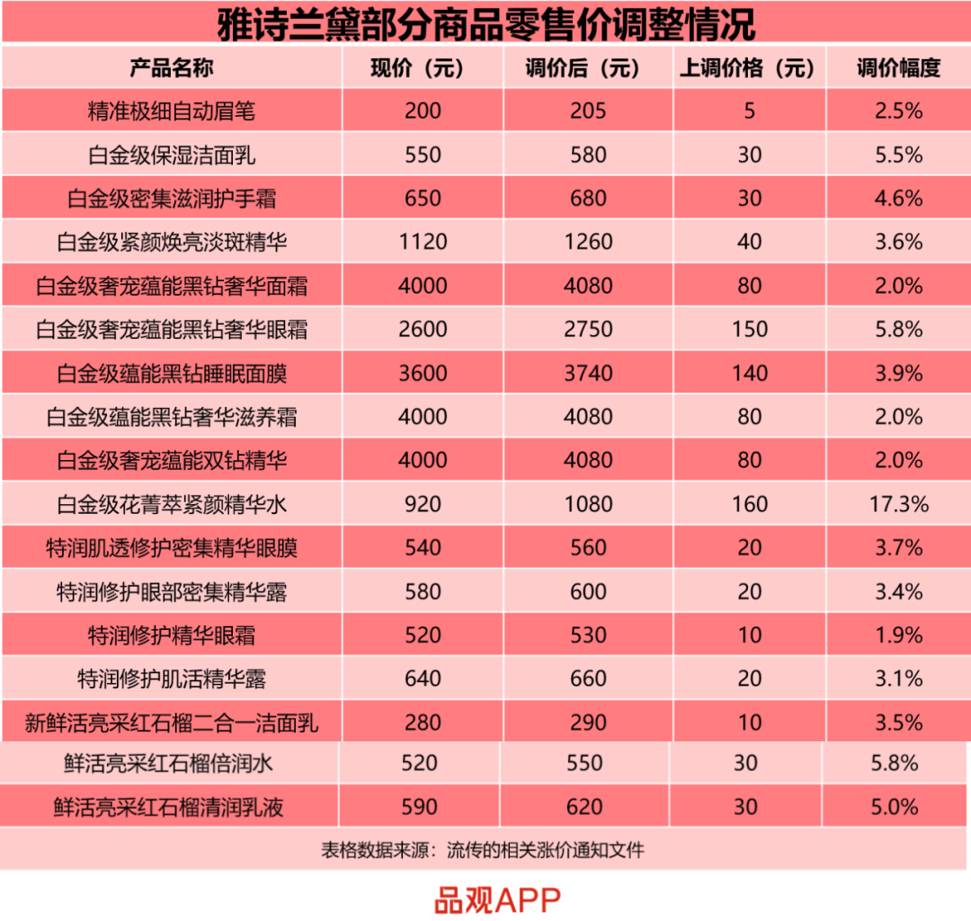 品观APP根据流传的相关涨价通知文件,对比雅诗兰黛官网价格,整理了部分商品调价清单。数据显示,包括雅诗兰黛小棕瓶、雅诗兰黛红石榴系列在内单一产品,零售价将上涨5元-160元不等,涨幅在1.9%-17.3%之间,大部分单品价格涨幅在6%以下。