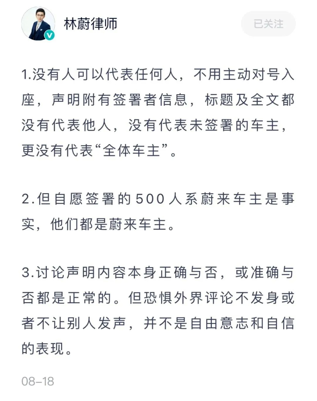 智驾君没能联系上林蔚,有媒体称他回应表示:该声明并没有与蔚来官方联系沟通,受平台限制,只有500名车主签署,并且发起的目的是想要对外展示一下蔚来车主的理性形象。