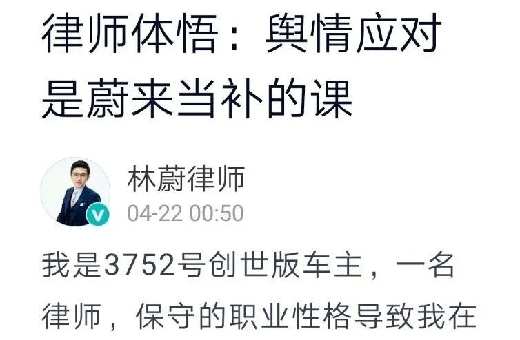 曾写过《律师体悟:舆情应对是蔚来当补的课》的林蔚显然因声明之事引发了蔚来成立以来最汹涌的一次舆情。