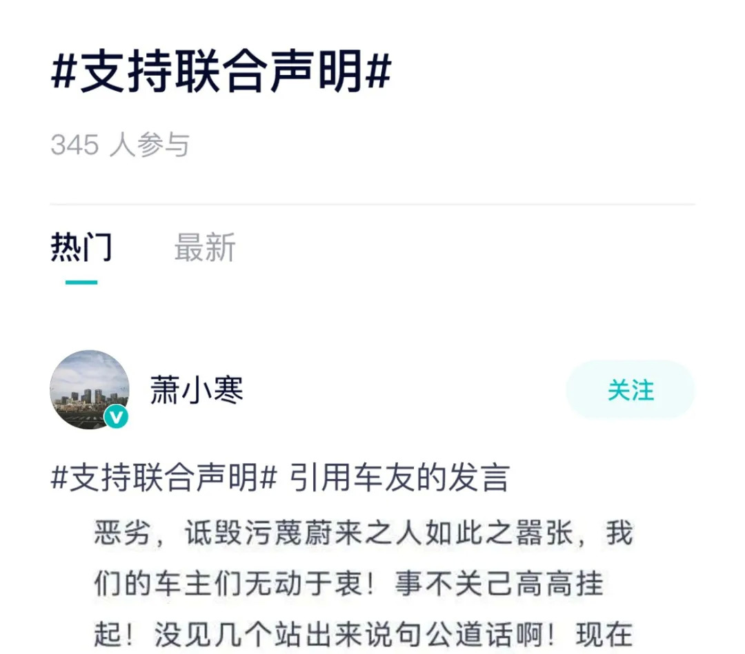 而蔚来做为旋涡中涉事方在这样一份力挺自己的声明面前,又不方便再发一份官方声明,否认此声明来自官方,在面对车主的问询时只能简单回应是“车主自发组织”。