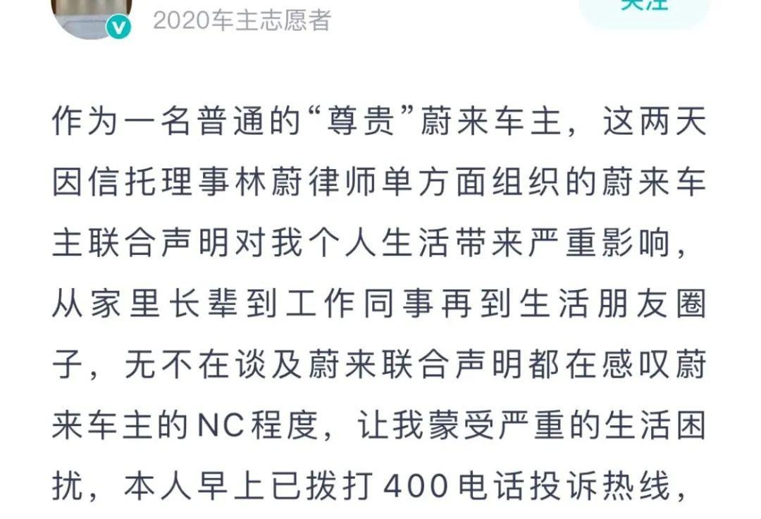 “联合声明对我个人生活带来严重影响,从家里长辈到工作同事再到生活朋友圈,无不在谈论蔚来声明,让我蒙受严重的生活困扰。”