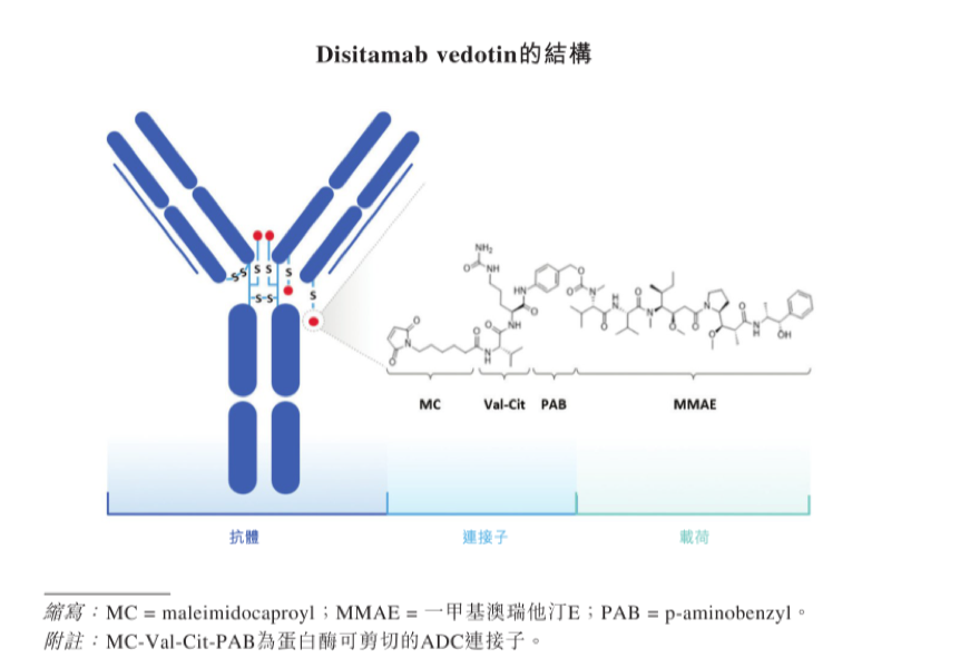 其中抗体负责和肿瘤细胞表面的特异性靶点结合,连接子负责连接抗体和毒素细胞,小分子毒素则负责释放毒素使肿瘤细胞凋亡。