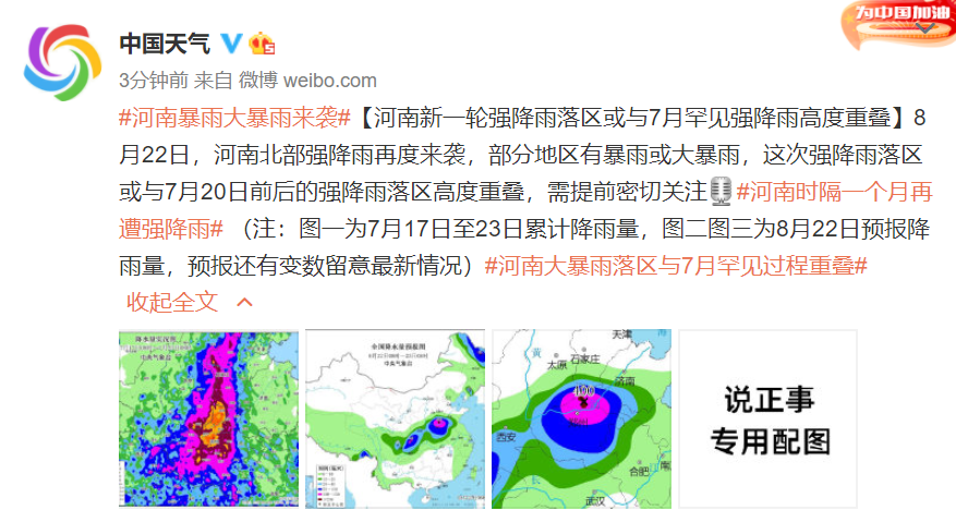 8月22日,河南北部强降雨再度来袭,部分地区有暴雨或大暴雨,这次强降雨落区或与7月20日前后的强降雨落区高度重叠。