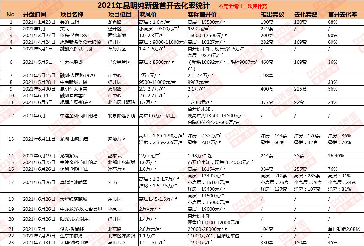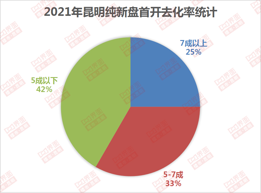据不完全统计,年内昆明共有23个纯新盘首开入市。从昆明地产大数据和中原地产统计的12个项目的开盘数据来看,去化率超7成的项目占比约33%,去化率在5~7成之间的项目占比约25%,去化率在5成以下的楼盘占比约42%,整体去化率约58%。