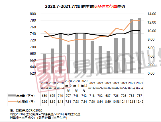 据昆明地产大数据统计信息显示,截至7月,住宅存量达787万方,去化周期增长至12.42个月。不止于此,年内,昆明预计还有近40个新盘入市,住宅库存量或将不断增加。