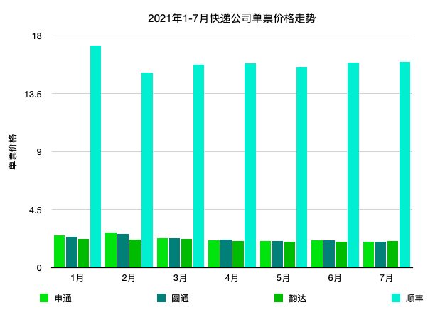 从环比来看,韵达和顺丰7月的单票价格较6月有所上涨,申通、圆通的单票价格则有不同程度的下调,申通甚至突破了2元大关。