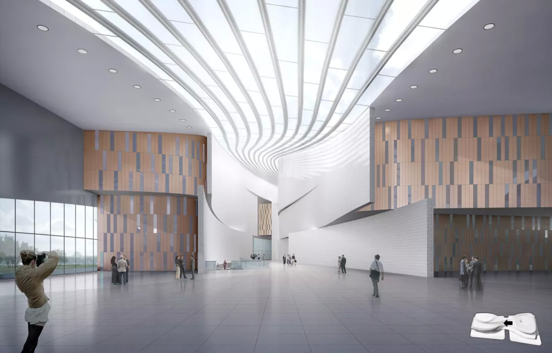 在滨河界面的塑造上,呼应城南河走势,采用曲线型建筑形态 同时向四周延展,柔化了与周边高层建筑的空间关系,创造出丰富的界面形象 并以一种轻盈雅致的姿态锚固在场地之中。文化中心与周边建筑既融为一体,又表达出自身特有的文化属性。