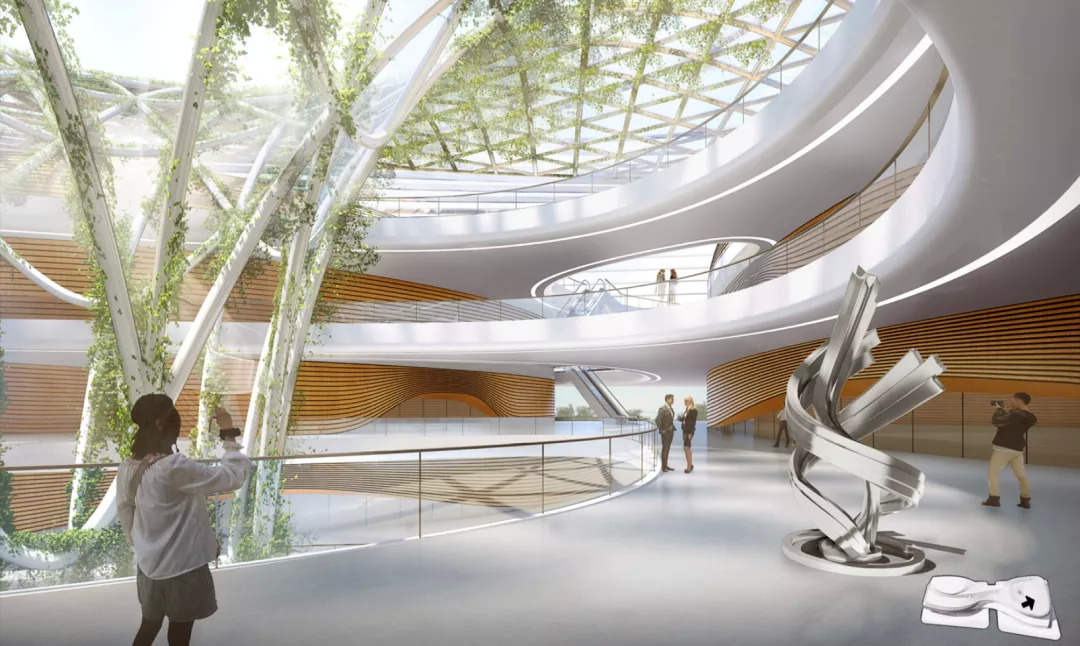 图书馆与科技馆一侧的“光之庭”则随着明珠体量的建筑表皮倾泻而下,内外一体,体现自然人文与科技的融合之美。