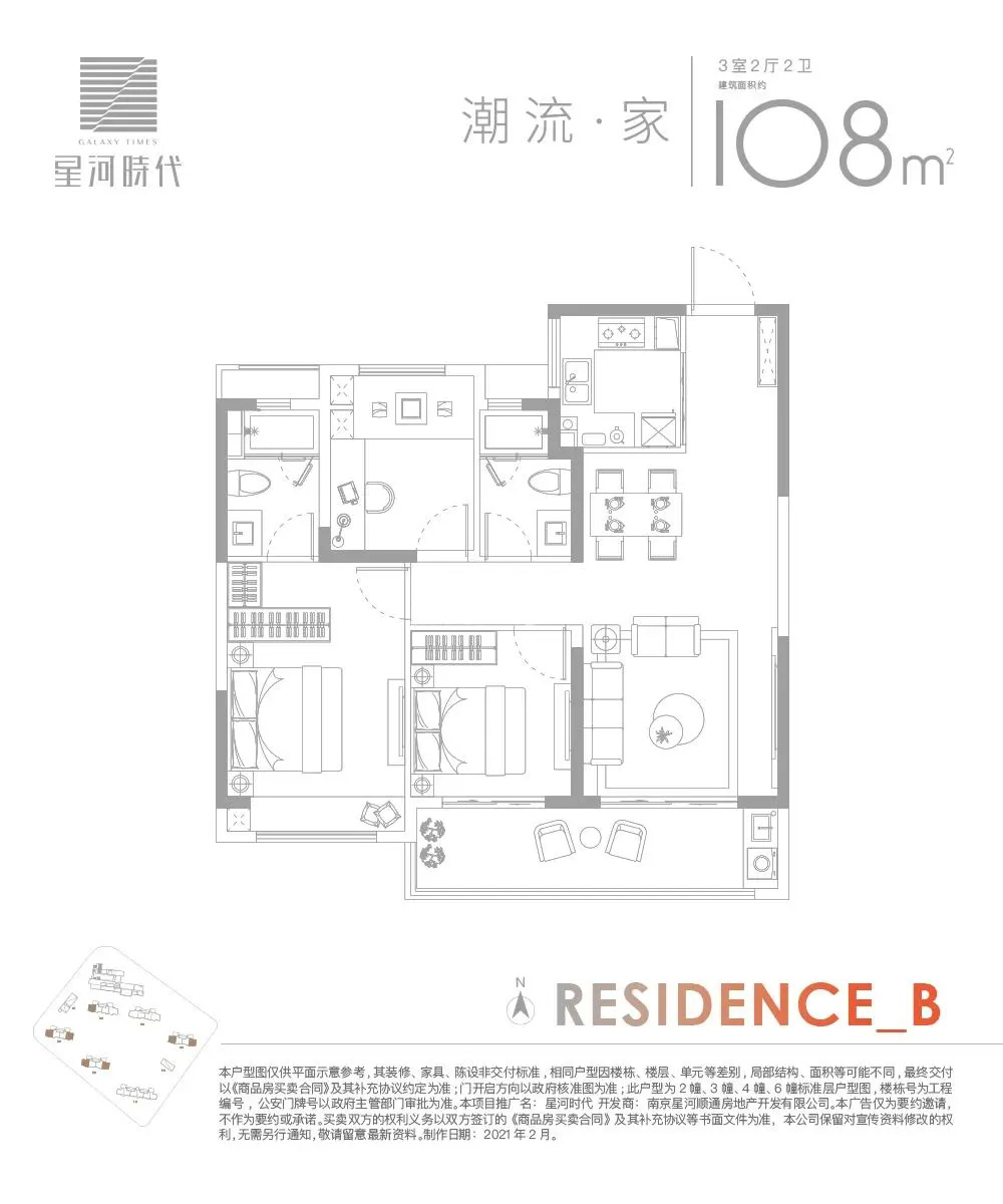 108㎡三房两厅两卫:三开间朝南,南向双阳台,主卧套房设计,全明户型,两卫设计。