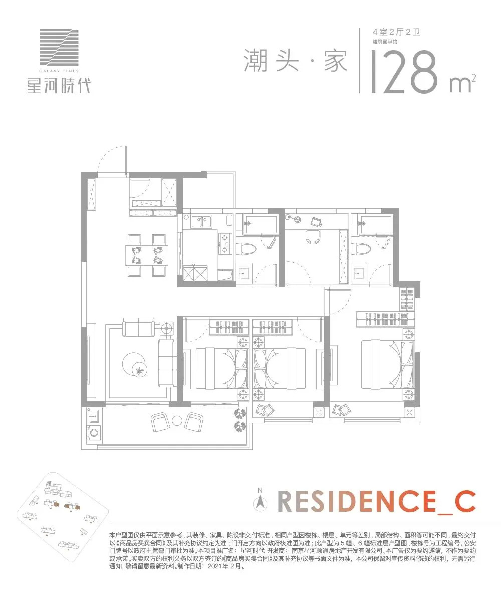 128㎡四房两厅两卫:大开间短进深,四开间朝南,南向双阳台,独立玄关,主卧套房设计,独立卫浴步入式衣帽间。