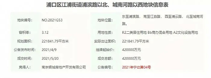 2020年5月末,该地块被银城以42亿总价拿下,打造浦口城南中心超级综合体。项目将由银城和融创联合打造。