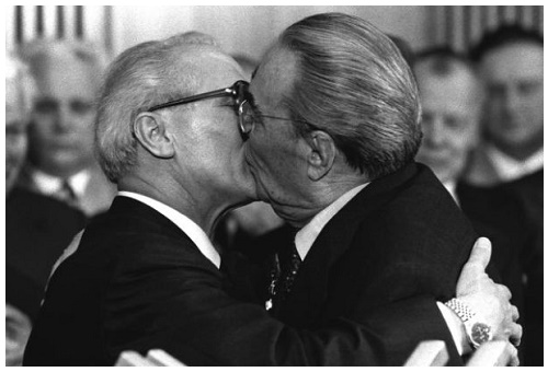 据美联社14日报道,这幅壁画位于立陶宛首都维尔纽斯一家名为Keule Ruke(意为“熏猪”)的烧烤店墙外,店老板Dominykas Čečkauskas委托当地艺术家Mindaugas Bonanu所作。这幅作品之所以引起关注,是因为它模仿了1979年冷战时期的一张著名照片:时任苏联领导人勃列日涅夫亲吻东德领导人兼盟友埃里希•昂纳克,以纪念东德成立30周年。这幅经典照片被称为冷战时期社会主义国家领导人之间的“兄弟之吻”,后来还被复制到了柏林墙上。