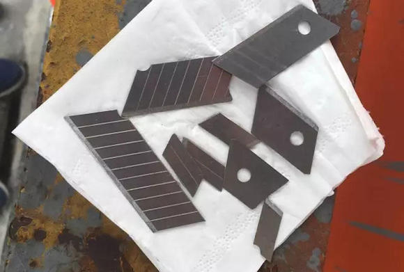 事发当天,在匝道口近百米的路面上铺满了刀片,“中招”车辆的车胎上,也发现了大大小小的刀片。从路政人员在现场收集到的刀片显示,有的保存完整,有的已经被车辆碾压成多节。