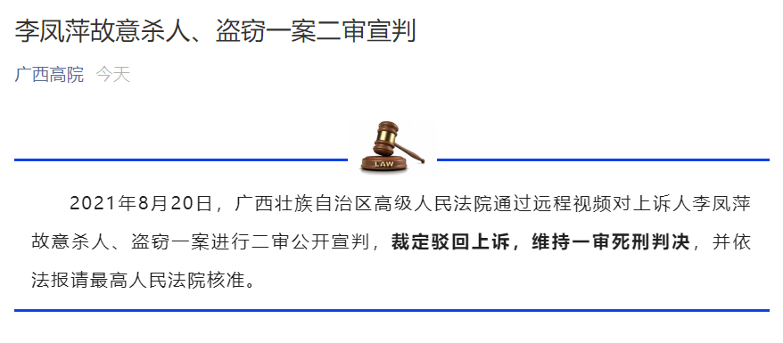 据“广西高院”微信公众号消息,8月20日,广西壮族自治区高级人民法院通过远程视频对上诉人李凤萍故意杀人、盗窃一案进行二审公开宣判,裁定驳回上诉,维持一审死刑判决,并依法报请最高人民法院核准。