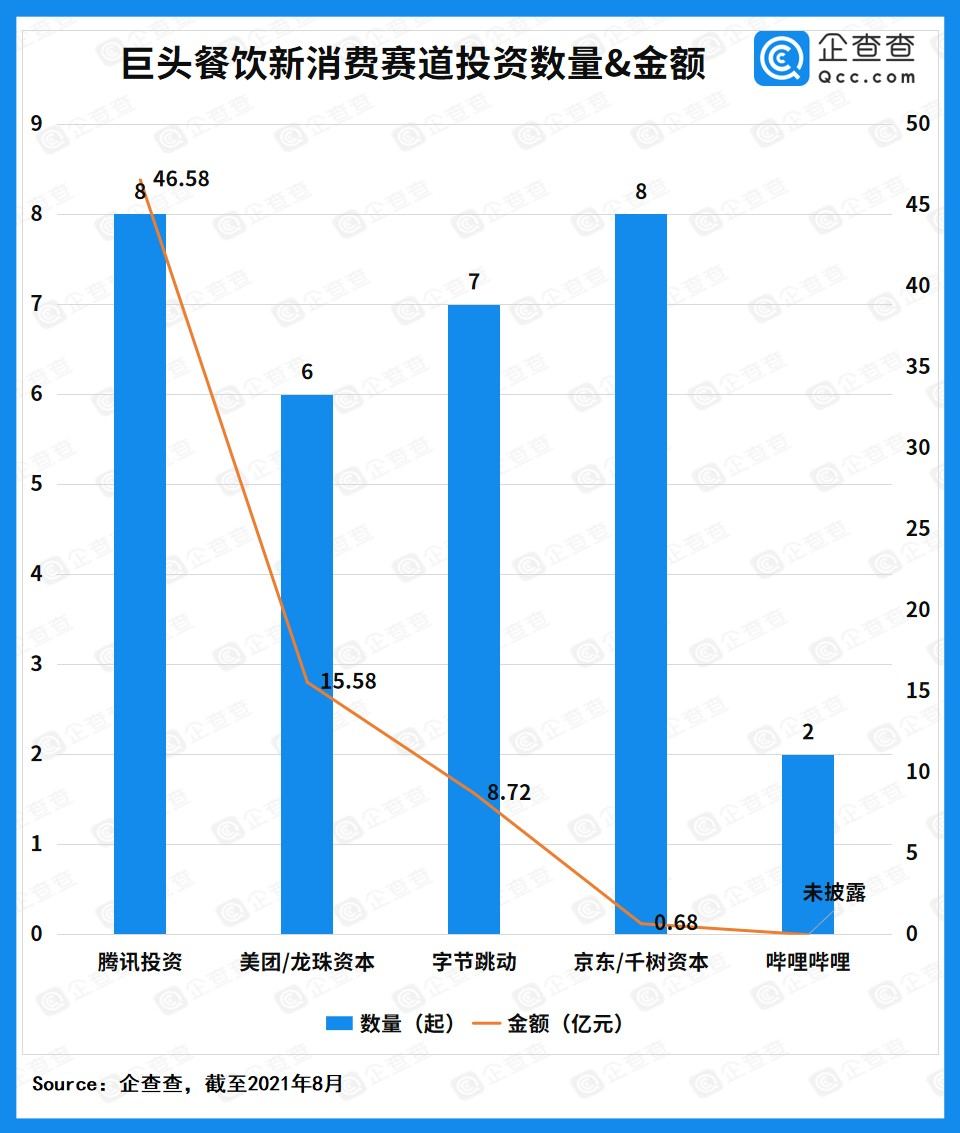 据企查查数据显示,截止2021年8月,互联网巨头在餐饮新消费赛道的投资超过71.56亿元,投资次数达31次。