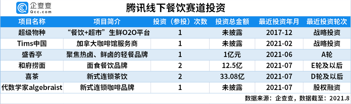 除却Tims外,腾讯投资的新式饮品还包括喜茶和代数学家algebraist。在国风快餐方面,连锁面食品牌“和府捞面”以及热卤轻餐品牌“盛香亭”也获得了腾讯过亿的投资。腾讯对其参投两次,D轮4.5亿元,E轮8亿元,刷新面馆融资记录。