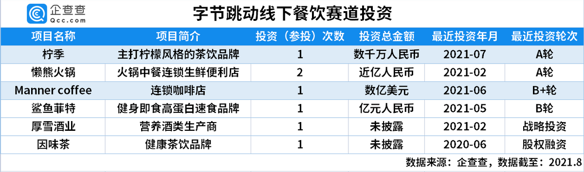细看赛道,字节跳动中意于新式饮品和速食项目。以近两年情况来看,2020年6月,字节对健康茶饮品牌因味茶进行股权融资;2021年2月,对营养酒类厚雪酒业进行战略投资;2021年6月,对连锁咖啡店Manner coffee进行数亿美元的B+轮投资;以及在7月份时对主打柠檬风格的柠季进行数千万元的A轮投资。