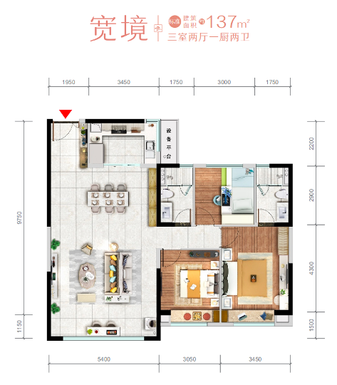 建面约137㎡三室宽境户型:整体户型方正,餐客厅一体式+U型厨房设计,约5.4米宽厅,公共区尺度阔绰;三面朝南,除客厅观景阳台外,南向双卧室带飘窗,整个房子的通透性和采光性非常好;主卧套房带有独立卫浴,可做干湿分离。