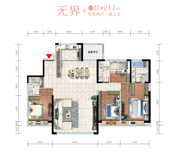 建面约217㎡四室无界户型:这是可以一步到位的“终改”户型。约6.6米横厅,给足了家庭成员活动空间,也为私人社交场创造了更大的互动空间;四面朝南,双套房带独立卫生间,尤其是主卧套房,空间大到足以容纳女主人的定制衣柜;多出来的一个功能间,办公、娱乐、亲子随心搭配。