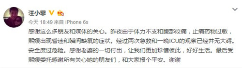 网传大S为了止痛,打麻药过量导致癫痫发作。大S妈解释说打了麻醉,但没有过量,大S是因为太痛才导致癫痫发作,昨天是有住进ICU,但她今天已经清醒并转进普通病房。而汪小菲在之后的微博中也解释道:“昨夜由于体力不支和腹部绞痛,止痛药物过敏,熙媛出现昏迷和瞬间缺氧的症状。经过两次急救和一晚ICU的观察已经并无大碍。安全度过危险。”