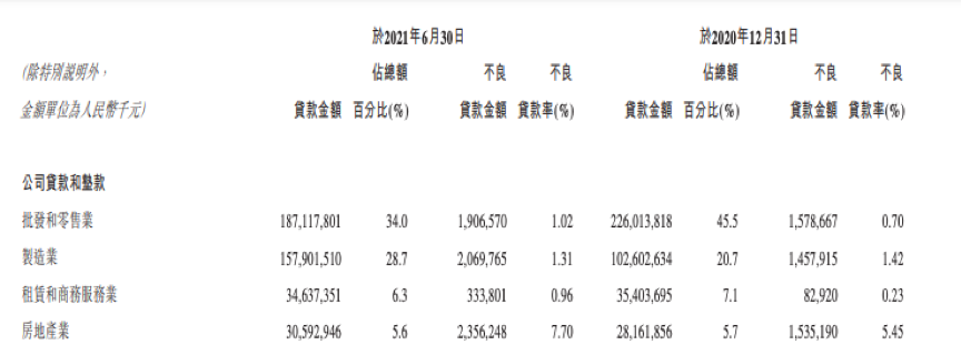 据半年报披露,锦州银行批发和零售、制造业、租赁和商务服务业、房地产等四类行业是其贷款和垫款最大组成部分,分别占比34%、28.7%、6.3%和5.6%。其中,房地产行业不良贷款率较高,为7.7%,较上年末上升2.25个百分点。