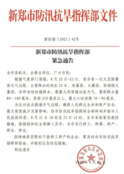 “新郑发布”微信公众号8月21日消息,新郑市防汛抗旱指挥部发布紧急通告指出,根据气象部门预报,8月22日-23日,新郑市有一次大范围暴雨天气过程,主要降水时段在22日,有暴雨、大暴雨,局部特大暴雨,并伴有短时强降水、雷暴大风等强对流天气,累积降水量80~180毫米,局部250毫米以上,最大小时雨强70~90毫米。
