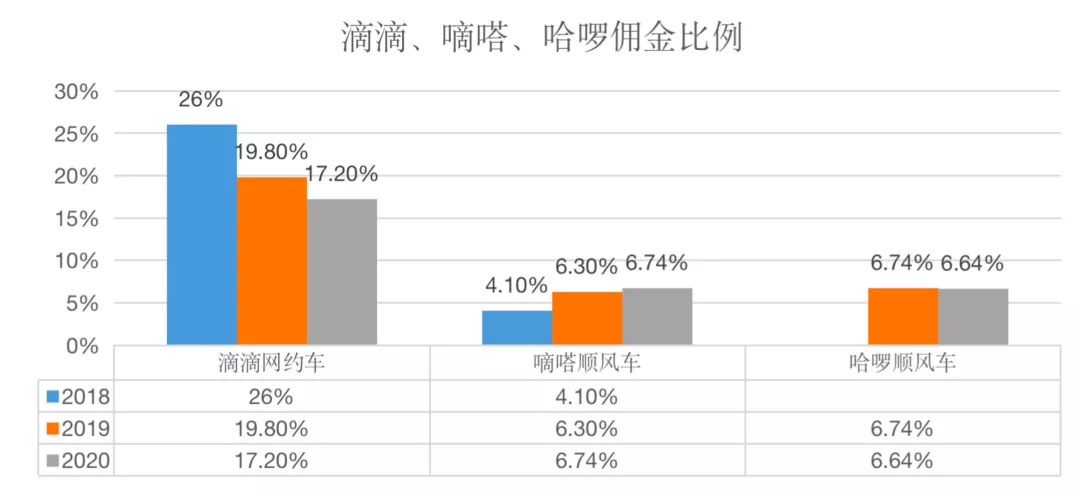 根据《豹变》梳理,虽然滴滴网约车2018-2020年的平均抽佣比例逐年下滑,但依然在15%以上,分别为26%、19.8%、17.2%。