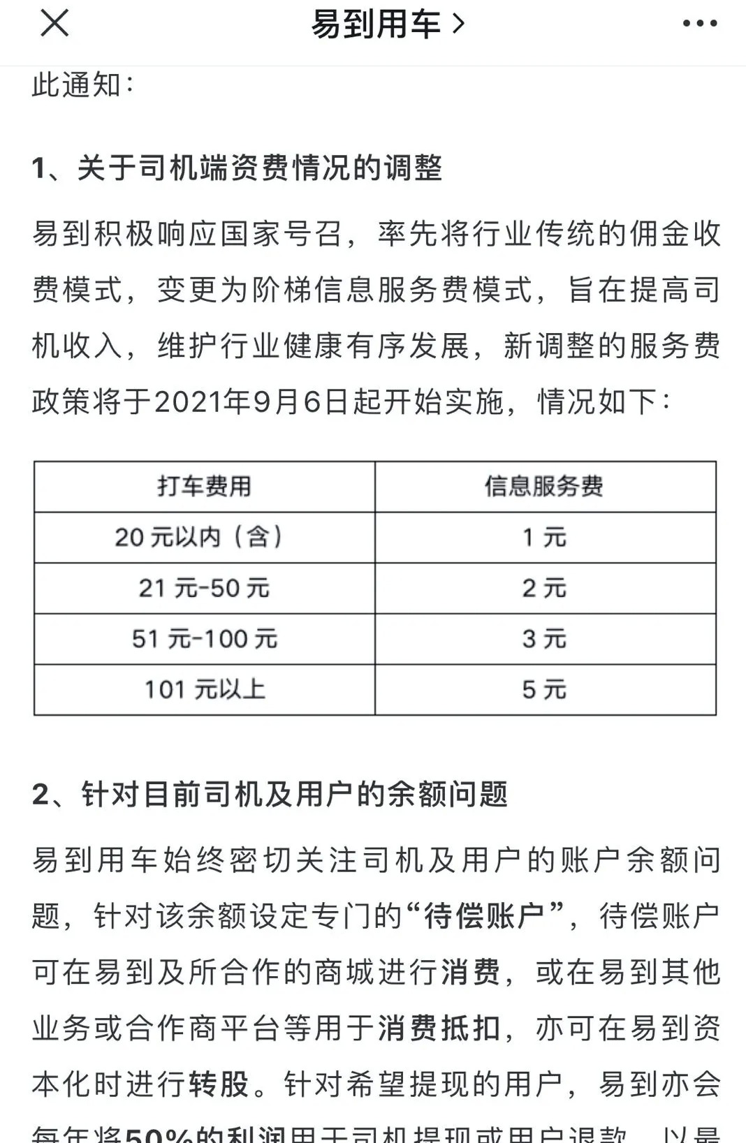 8月19日,易到用车在《司机端资费调整特别公告》中表示,要取消传统的抽成模式,变为信息服务服务费模式,按照阶梯模式收取费用,最低1元,5元封顶。“新政”于9月6日起执行。