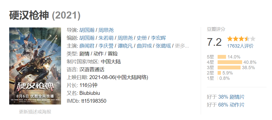 另一种对《硬汉枪神》的好评来源于对网络电影质量提升的惊喜。豆瓣短评中不乏类似《硬汉枪神》“对于网大来说确实是惊喜”的评论,也有观众为“网络电影已经发展成这样了”打出一定的友情分。