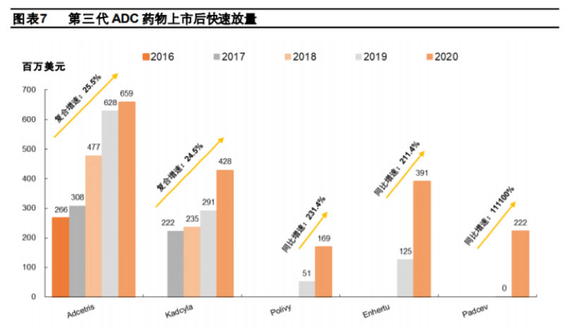 目前已上市的3款第三代ADC药物Polivy、Enhertu和Padcev在2020年均实现快速放量,分别实现收入1.69、3.91和2.22亿美元,同比增长231%、211%和111100%。