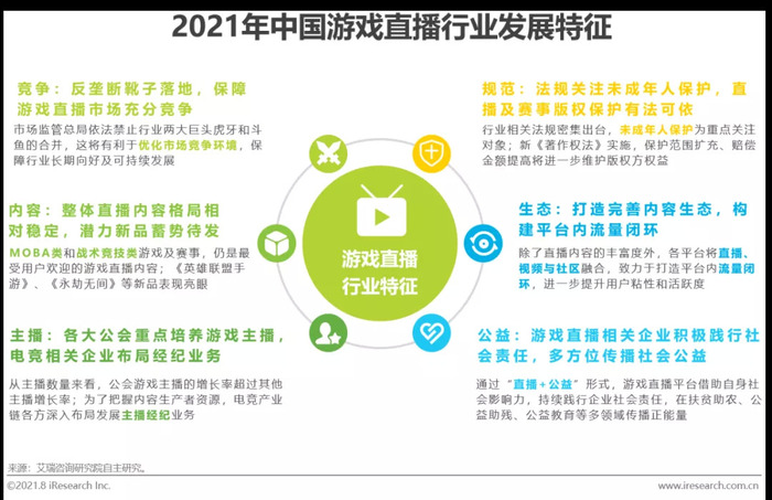 社会责任:在游戏直播相关企业用户影响力快速提升的同时,相关平台以“直播+公益”模式践行社会责任,传播社会公益,让游戏直播为社会发展贡献一份力量。