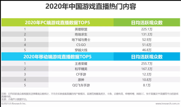 根据小葫芦大数据平台监测数据显示,2020年游戏直播内容综合数据排名靠前的端游和手游,主要仍是《英雄联盟》、《绝地求生》、《穿越火线》、《王者荣耀》及《和平精英》等经典电竞游戏,其中《穿越火线》及其手游在PC端和移动端TOP5中均有出现,证明了穿越火线这一IP长期的生命力和用户吸引力,而《原神》作为上榜移动游戏TOP5中唯一的非电竞游戏,随着游戏新内容的持续推出,其未来表现值得期待。在2021年,《英雄联盟手游》、《永劫无间》等热门游戏的上线,将不断提升游戏直播内容的用户吸引力。